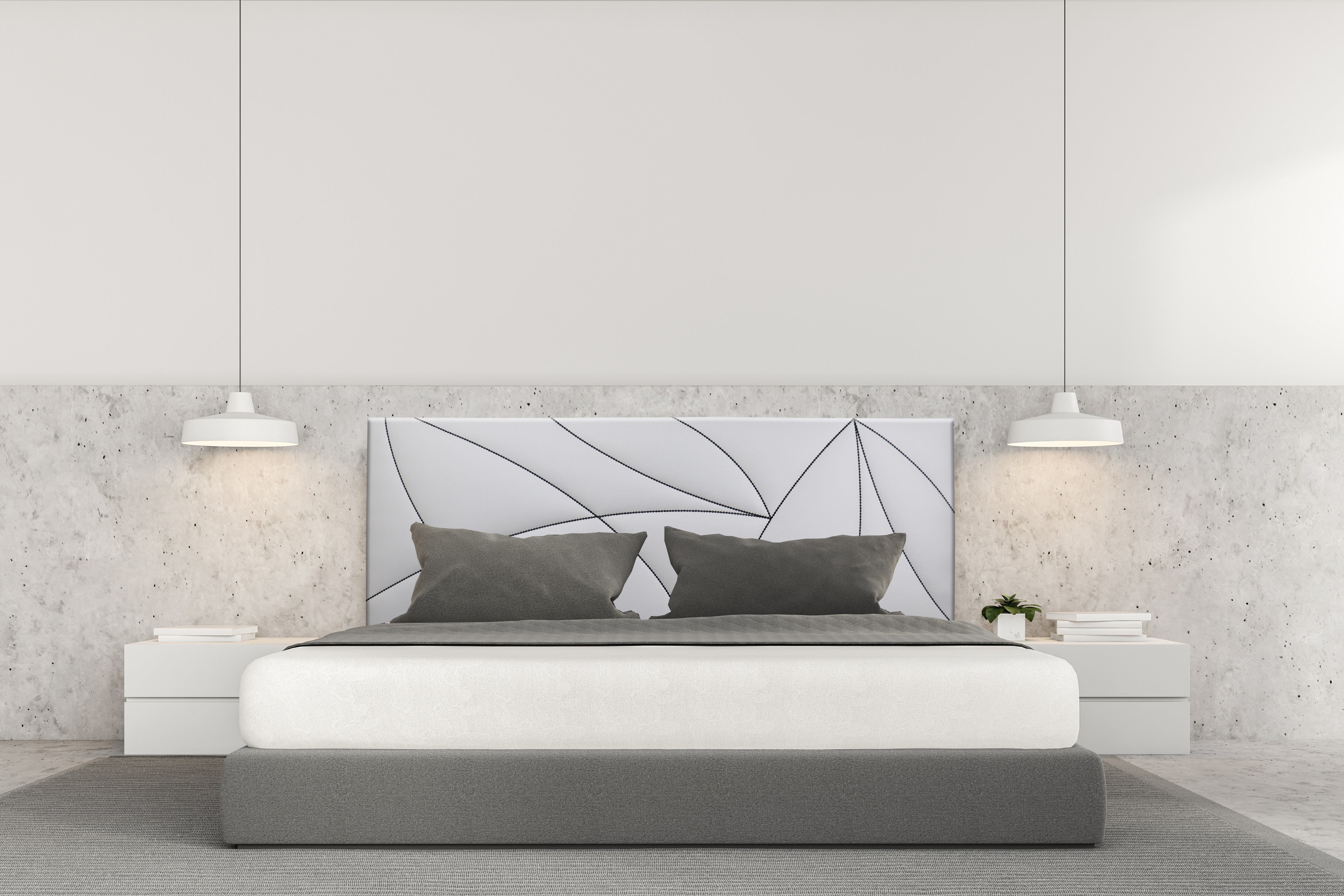 Cabecero cama con motivo bordado geométrico.